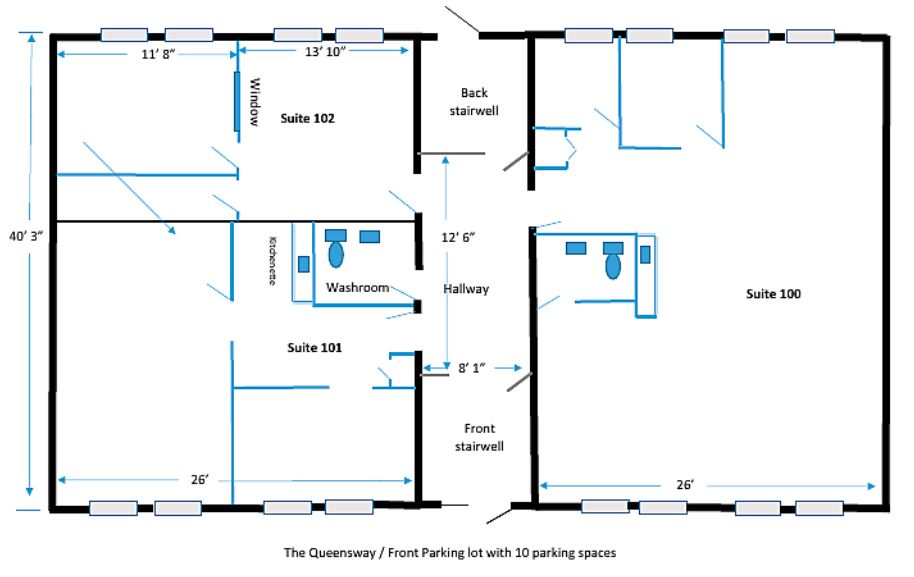 The first floor has 3 suites; 100, 101, and 102. Suite 100 is a half floor unit that runs from the front to the back of the building on the east side. Suite 100 includes a private washroom, kitchenette, hardwood floors, LED lighting, two offices, and CAT 6e cabling. Suite 101 is a quarter floor unit in the front southwest corner and Suite 102 is also a quarter floor unit in the northwest corner.