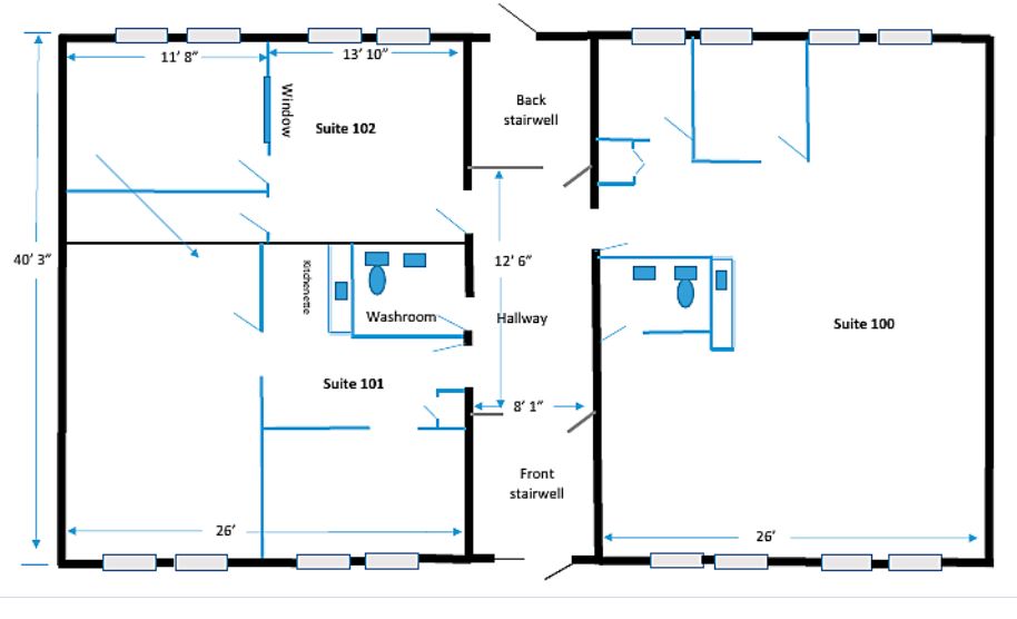 The first floor has 3 suites; 100, 101, and 102. Suite 100 is a half floor unit that runs from the front to the back of the building on the east side. Suite 100 includes a private washroom, kitchenette, hardwood floors, LED lighting, two offices, and CAT 6e cabling. Suite 101 is a quarter floor unit in the front southwest corner and Suite 102 is also a quarter floor unit in the northwest corner.