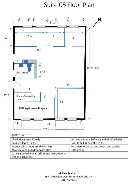 Suite 05 is a half floor suite, located on the lower east side of the building. The Suite includes four glass offices, a large storage closet, open spaces, a kitchenette and shares two hallway washrooms. This a beautiful space to build your business and wow your visitors. This is a half floor unit that can easily accommodate up to 12 people.